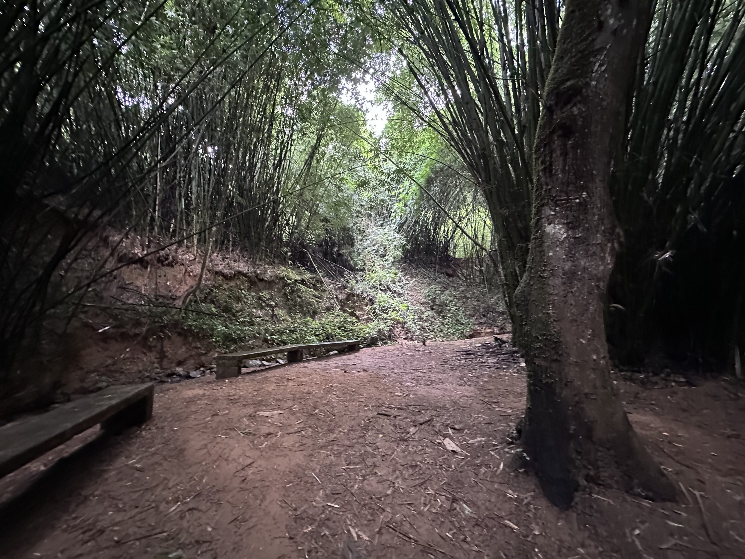 On sunny days the light filters through and the wind rustles the leaves to make for a very peaceful, awe inspiring setting. The guardians of the forest have built concrete benches and a small roofed portico that allow you to silently contemplate the beauty all around you.